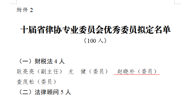 在担任十届省律协财税专业委员会委员期间,赵晓朴律师积极参与委员会各项工作,在专题研讨、业务指引、行业交流等方面发挥了骨干作用,为推动我省财税法律业务的专业化、规范化发展作出了积极贡献。此次获评优秀委员,既是对其履职表现的充分肯定,也体现出业界对其专业影响力的广泛认可。