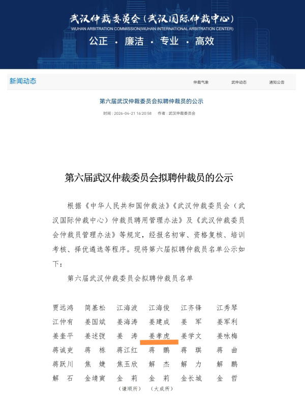 近日,武汉仲裁委员会公布第六届仲裁员名单。经过报名初审、资格复试、培训考核、择优遴选等严格程序,北京金台(合肥)律师事务所姜孝虎律师成功当选。